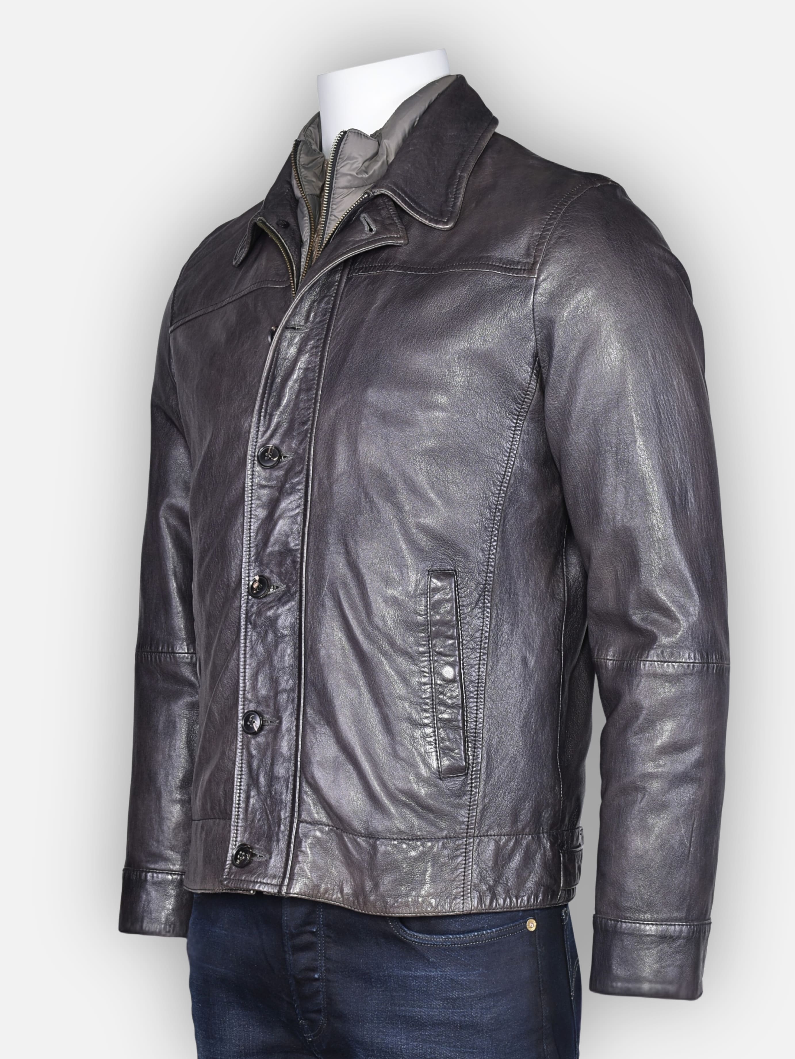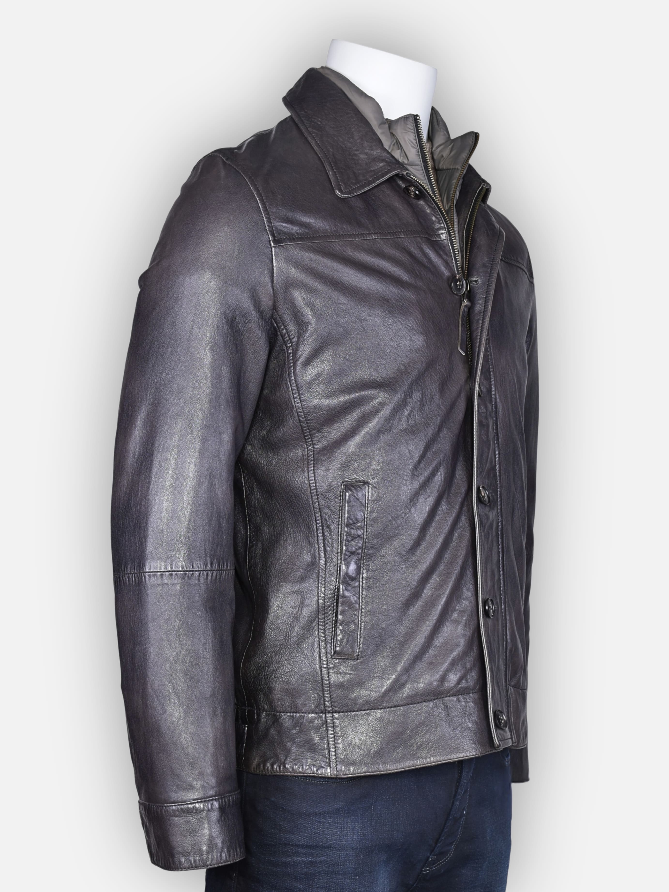 Diese Liebhaberjacke überzeugt durch edles, pflanzlich gegerbtes Nappaleder in einem stilvollen Grauton. Der natürliche Glanz und die feine Struktur des Leders verleihen der Jacke eine hochwertige, authentische Optik. Die herausnehmbare Nylonblende sorgt für Flexibilität im Look, ideal für jede Gelegenheit.